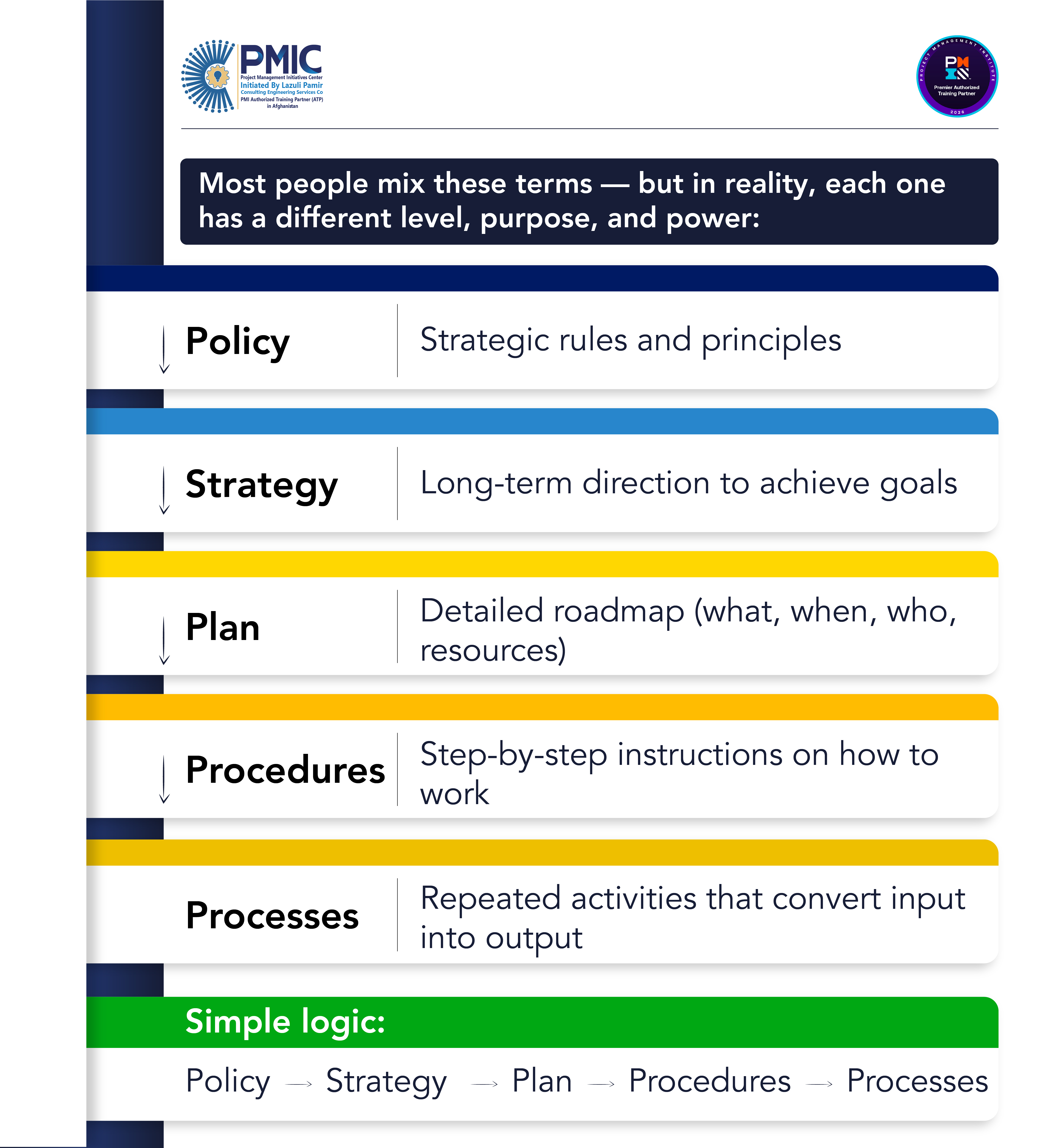 Many professionals use policy, strategy, plan, procedures, and processes interchangeably. In reality, each operates at a different level with a distinct purpose and authority. This infographic clearly explains how strategic rules guide long-term direction, how plans translate strategy into action, and how procedures and processes ensure consistent execution. A simple visual logic to strengthen governance, management, and project success.