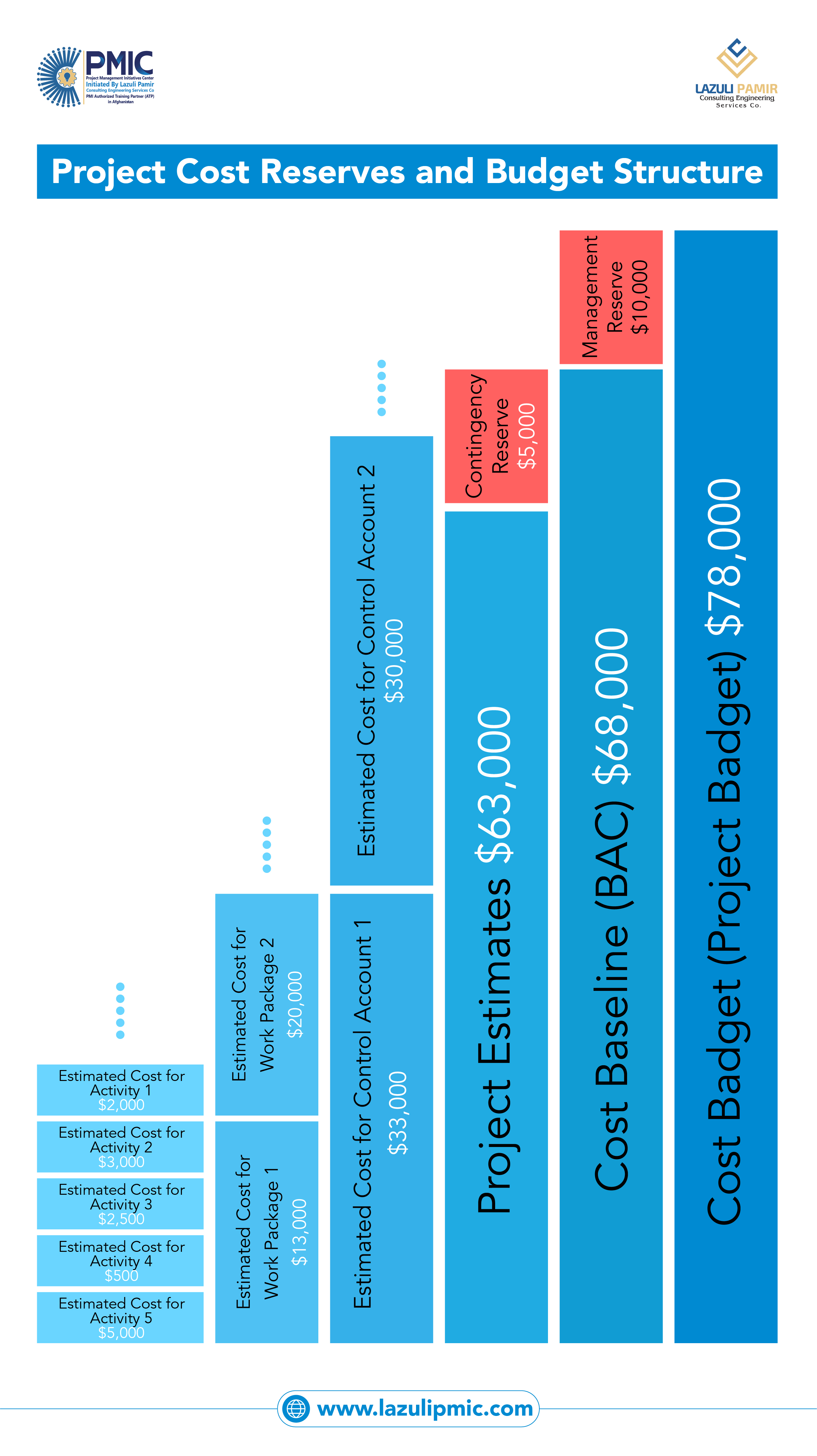 This infographic illustrates how project costs are progressively aggregated—from activity estimates to work packages, control accounts, and the overall project estimate. It clearly shows the relationship between contingency reserve, cost baseline (BAC), and management reserve, helping project managers understand how the total project budget is formed. A practical visual aligned with PMBOK® concepts, ideal for PMP® aspirants and professionals managing cost planning, budgeting, and control.
