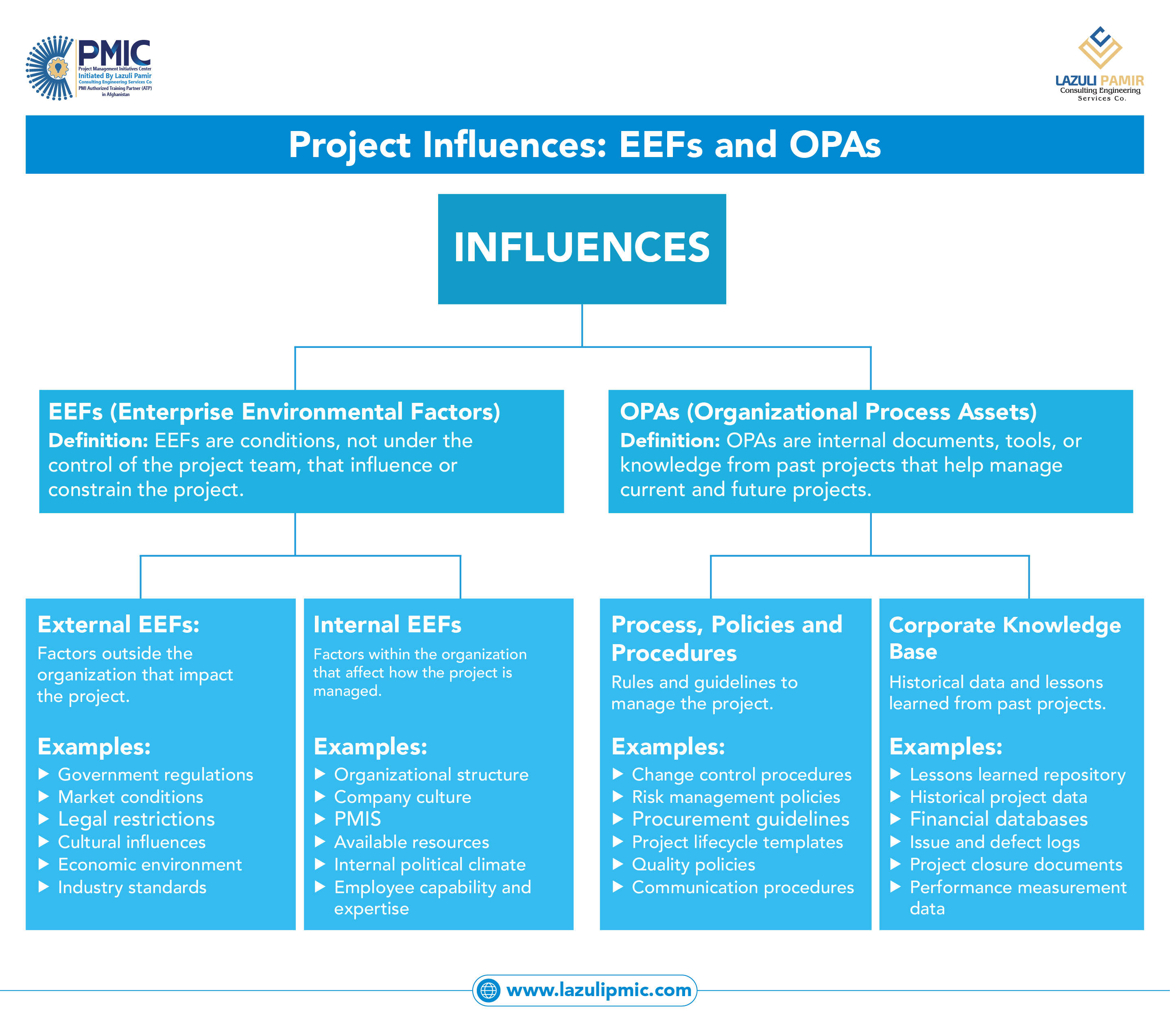 This infographic explains the two major influences on every project according to PMBOK®: Enterprise Environmental Factors (EEFs) and Organizational Process Assets (OPAs). It clearly distinguishes between external and internal EEFs that constrain or shape project decisions, and OPAs such as processes, policies, procedures, and organizational knowledge that support project execution. A simple, structured visual designed to help PMP® aspirants and project professionals quickly understand how projects are influenced beyond the project manager’s direct control.