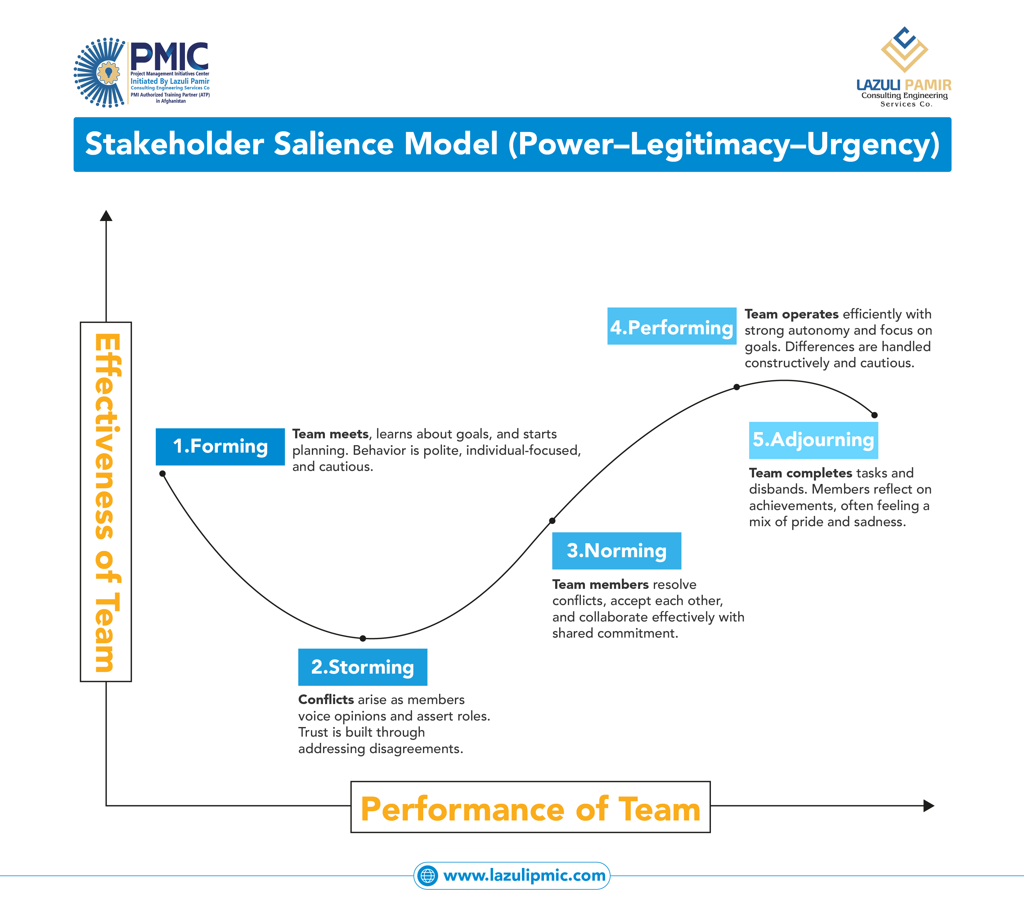 This infographic illustrates Tuckman’s Team Development Model, showing how teams evolve through five stages: Forming, Storming, Norming, Performing, and Adjourning. It highlights how team effectiveness and performance change over time as members build trust, resolve conflicts, collaborate effectively, and ultimately complete their work. Understanding these stages helps project managers anticipate team behaviors, apply the right leadership approach at each phase, and improve overall project performance in line with PMP® and PMBOK® practices.