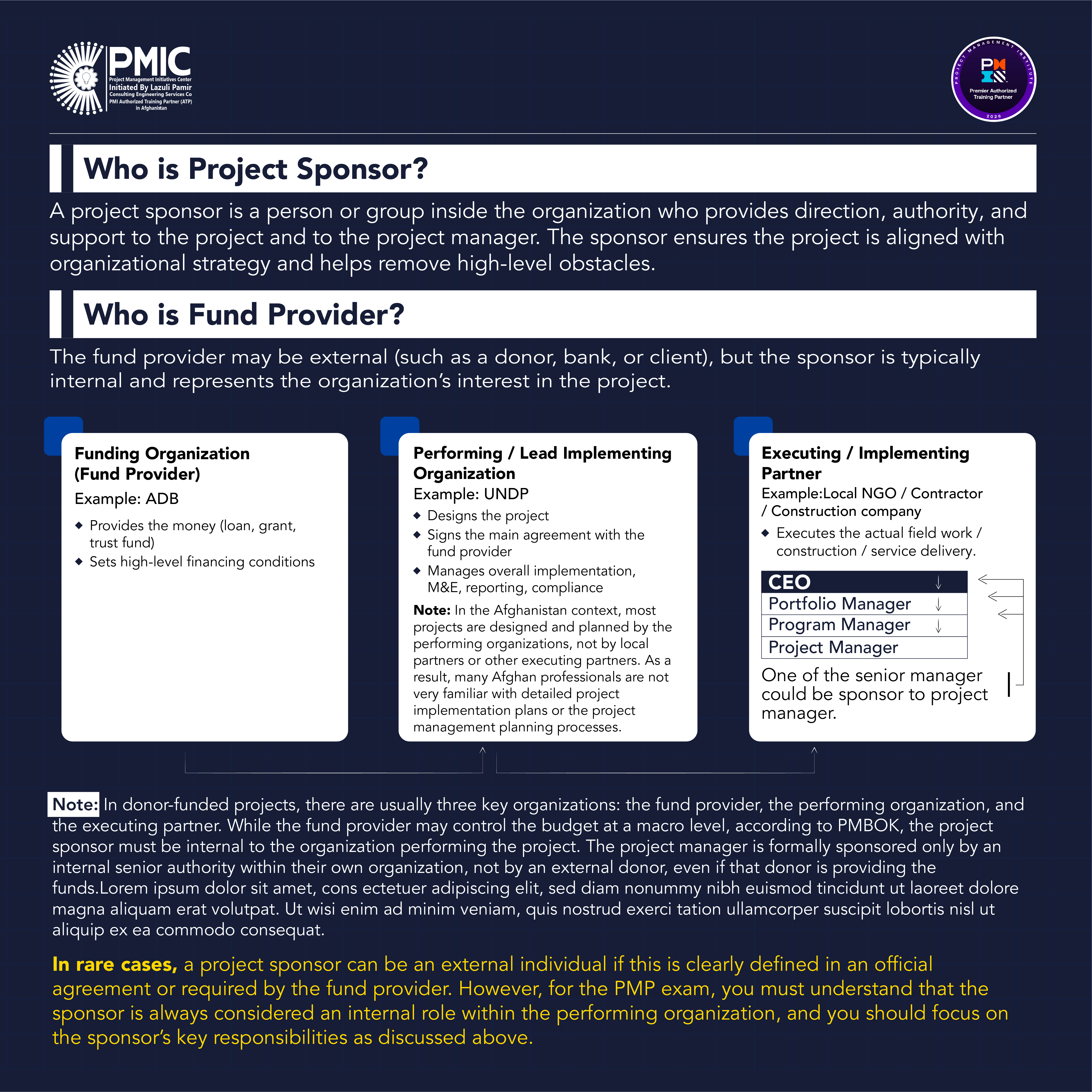This infographic clarifies one of the most misunderstood concepts in project management: the difference between the project sponsor, fund provider, performing organization, and executing partner. It explains who truly sponsors a project according to PMBOK® guidance, especially in donor-funded environments. By highlighting internal sponsorship, authority lines, and real-world examples from Afghanistan, this visual helps project managers, NGO professionals, and PMP aspirants clearly distinguish governance roles and avoid common misconceptions.